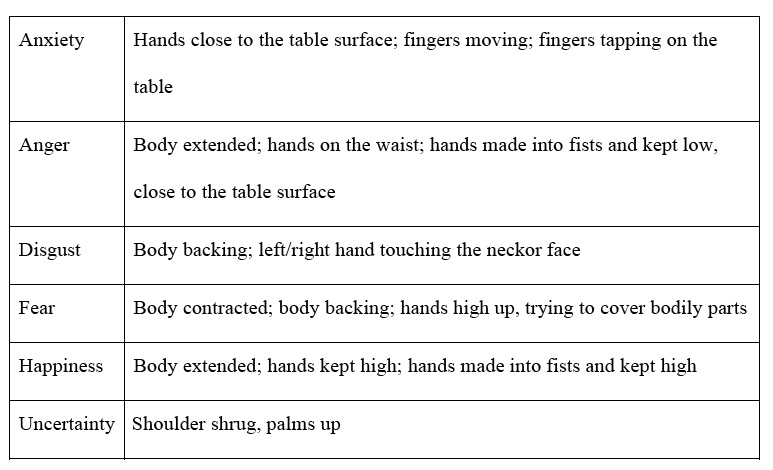This table suggests that certain emotions may be assessed by certain body movements. For example, this table suggests that hands resting on the waists or made to fists appear to be indicators of anger in an individual. Moreover, the table indicates that signs of anxiety in participants may be detected through observations of the location of their hands on the table surface.